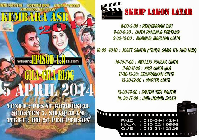 Gila Gila Blog harmonikawan, April 2, 2014 Alhamdulillah dengan izin Allah swt, akhirnya, gua dengan naja dan q razalo dan rakan rakan ASB akan menganjurkan KEMBARA ASB 2014, dengan episod pertama Gila Gila BLOG. Hoo apa yang menarik ni ? Best ke ni ? Hooo memang terbaik , sambil korang belajar tulis blog, banyak lagi benda best untuk korang hadam NAJA KELUARKAN KUASA BEKAM SINAR kali ni naja sudi untuk menguruskan majlis perkahwinan din dan lydzar, eh silap, rupanya kelas blog , dengan nya gila gila cinta. Naja akan menunjukkan cara menyemarakkan cinta sampai wartawan media hiburan pun tertanya tanya blog siapa yang hebat sangat tuh, sampai boleh buat sales shaklee. AK KEMBALI MUDA ? Walaipun AK tak dapat menerima kenyataan yang aku masih muda remaja, tapi semangat nak datang jugak malam ni, sambil minum teh tarik, sambil berbincang pasal isu musa hitam dengan abang naja. KAMAR YANG MUNCUL TIBA TIBA ? tapi aku rasa terkejut dan teruja dengan khalid jamlus uitm yang dah jadi master, nampaknya rahsia makan telur separuh masak yang sedap lagi bertenaga, hoo tentu ada je yang suka teknik tenaga master DIN, aura master november 2013. Hooo mantap. Oklah gua dah penat, mahu tidur Related Related Posts:Kembara ASB ke Kota KinabaluReview Blog iReach : Kenapa Anda Perlu Mendaftar…Orang MELAKA SUKA Tulis BLOG ?Ini Kalilah Kita Blogging di SabahTulis BLOGBagaimana Cara Nak Jemput Rakan Like Fanpage di Facebook ?Refleksi Tsunami ShakleeRahsia Penulisan Penuh Emosi Blogger Terkenal EizilMacam Mana Nak SEO kan BLOG SAYA ?KONSPIRASI MH370 : Ke mana Arah Tuju Kita ? SAINS